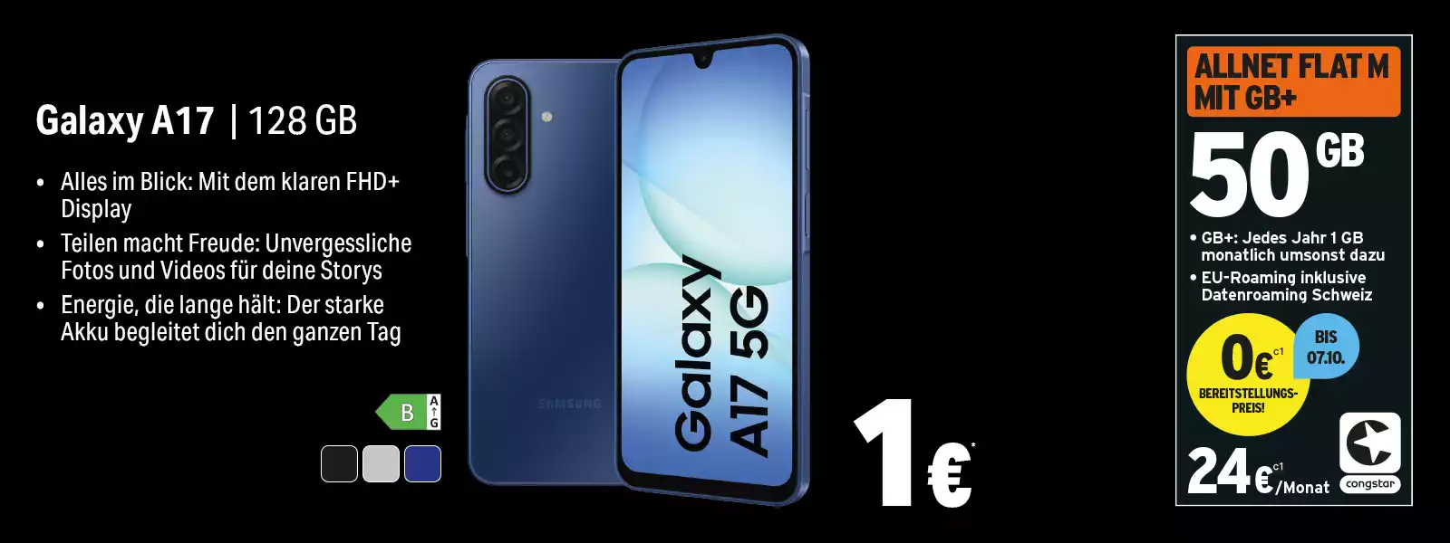 c1) Aktion für Neukunden bei Buchung bis zum 07.10.2025: Die congstar Allnet Flat M mit GB+kostet monatlich 24 €. Mindestvertragslaufzeit 24 Monate. Einmaliger Bereitstellungspreis 0 € statt 15 €. Die Bandbreite wird ab einem Datenvolumen von 35 GB statt 15 GB im jeweiligen Monat von max. 50 Mbit/s im Download und 25 Mbit/s im Upload auf max. 32 Kbit/s im Download und Upload beschränkt. Voraussetzung für das Surfen im 5G-Netz ist die Verfügbarkeit von 5G am Standort und ein 5G-fähiges Endgerät. Sofern 5G am jeweiligen Standort nicht verfügbar ist, surfst Du mit EDGE/LTE. GB+: Das monatliche Datenvolumen erhöht sich im Tarif Allnet Flat M alle 12 Monate um jeweils 5 GB. Bei Tarifwechsel in einen anderen Tarif gelten die Konditionen des neuen Tarifes. Für jedes Vertragsjahr im bisherigen Tarif erhält der Kunde das GB+ Volumen, welches für den neuen Tarif gilt. Das heißt: GB+ Volumen pro Vertragsjahr im bisherigen Tarif bei Wechsel in die Allnet Flat XS 1 GB, bei Wechsel in die Allnet Flat S 2 GB und bei Wechsel in die Allnet Flat L 10 GB.