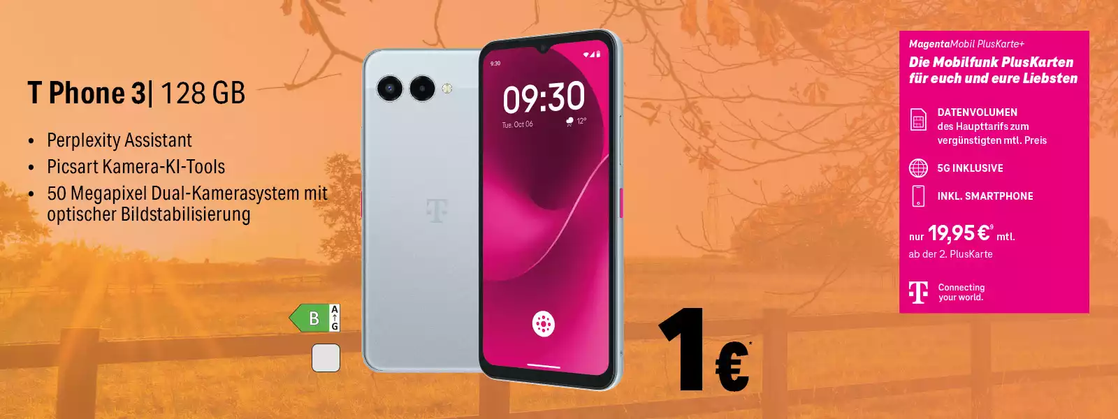 9) Voraussetzung sind ein bestehender Telekom Mobilfunk-Laufzeitvertrag (XS–XL), vermarktet ab dem 06.09.2019, z. B. MagentaMobil XS für 29,95 €/Monat, und eine MagentaMobil PlusKarte mit einem monatlichen Grundpreis von 19,95 € oder alternativ eine Family Card S–XL als Zweitvertrag. Ausgeschlossen sind Young Tarifeund Tarife der Marke congstar. Monatlicher Grundpreis beträgt 9,95 € (ohne Smartphone), 19,95 € (mit Smartphone), 29,95 € (mit Top-Smartphone), 39,95 € (mit Premium-Smartphone) und 49,95 € (mit Premium-Plus-Smartphone). Mindestlaufzeit 24 Monate. Das Inklusivdatenvolume (EU, Schweiz und Großbritannien) entspricht dem des zugehörigen Hauptvertrags. Nach Verbrauch des Datenvolumens wird die Bandbreite im jeweiligen Monat auf max. 64 KBit/s (Download) und 16 KBit/s (Upload) beschränkt.