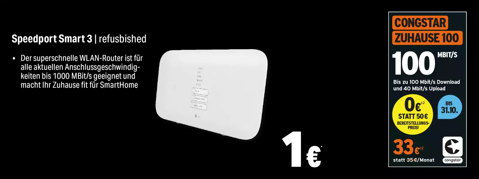 c2) Neukundenaktion bis zum 31.10.2025. congstar Zuhause 100 kostet 33 statt 35 €/Monat. Mindestvertragslaufzeit: 24 Monate. Einmaliger Bereitstellungspreis: 0 € statt 50 €. Voraussetzung für die Nutzung des Tarifs ist ein geeignetes Endgerät (gegen Aufpreis erhältlich) congstar Zuhause 100 ermöglicht eine Datennutzung von max. 100 Mbit/s im Download und 40 Mbit/s im Upload. Ohne Festnetz-Telefonie. congstar Zuhause ist in vielen Anschlussbereichen verfügbar. Vertragspartner der Festnetzleistung: congstar, eine Marke der Telekom Deutschland GmbH, Bayenwerft 12–14, 50823 Köln.